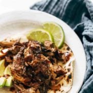 Instant Pot Method: Cut the pork into 3-5 large chunks. Add to the Instant Pot with the other ingredients as stated in the original instructions. Cook on manual high pressure for 30 minutes, and allow for a natural release. Shred, broil in the oven, and serve!