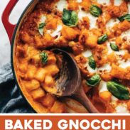 Baked Gnocchi with Vodka Sauce! Seriously cozy, seriously addicting. Pillowy-tender gnocchi tossed with an easy five-ingredient vodka sauce, baked under a layer of mozzarella, parmesan, and basil.